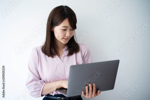 woman, business, work, ol, secretary, work, labor, employee, young, sweet, smile, appealing, beauty, white background, working girl, woman, people, portrait, japanese, asian, shirt, waist, noto, personal computer, laptop, personal computer, possess, spend