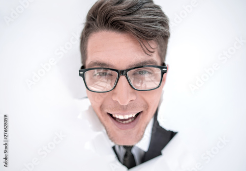 paper, white, fractured, wall, breakthrough, impact, power, appearance, hole, damaged, tearing, business, goggles, young, man, portrait, male, person, adult, photogenic, face, professional, people, caucasian, smart, looking, background, guy, work, confident, men at work, 1, success, job, closeup, smile, corporate, successful, modern, entrepreneur, casual attire, manager, isolated, lifestyle, shirt, attractive, executive, spectacle, human, eye