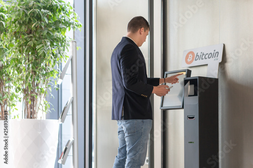 Young businessman buying cryptocurrency on ATM machine for buying and selling cryptocurrency.