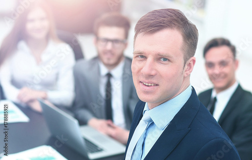 young businessman looking at the camera on the background of his team