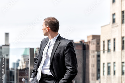 business, businessman, rooftop, hand, pocket, up, over, shoulder, city, people, concept, job, man, office, modern, urban, city landscape, skyline, person, standing, roof, success, new york city, building, skyscraper, suit, search, career, young, male, professional, 1, outside, interview, outdoors, lifestyle, successful, confident, manhattan, white, promotion, brick, finance, work, executive, boss, shirt, attaching