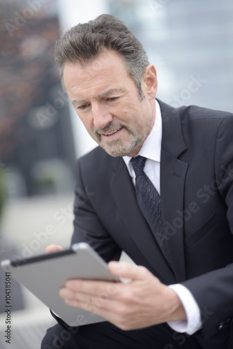 businessman, digital, tablet, online, beard, reading, portrait, business, outdoors, working, smile, wireless, ipad, suit, cyberspace, day, manager, people, computer