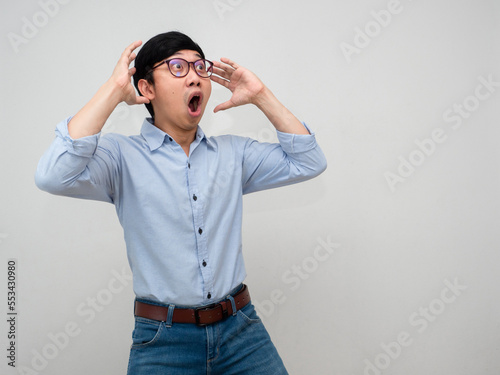 Young businessman wear glasses feels shocked gesture looking isolated