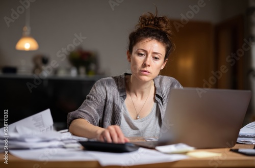businesswoman, laptop, paperwork, home office, concentration, determination, workspace, casual attire, calculating machine, indoor, focused, young adult, productivity, technology, document, working, professional, female, desk, clutter, modern, serious, lifestyle, organisation, planning, analysis, multitask, communication, cyberspace, research, task, writing, studying, creative, idea, brainstorming, light, furniture, cosy, ambience, personal, career, entrepreneurship, management, financial, strategy, time management