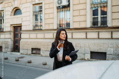 Young businesswoman sending voice message on smartphone on the street