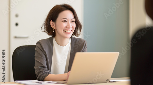 businesswoman, laptop, meeting, office, smiling, work, business, computer, technology, professional, young, woman, asian, communication, corporate, desk, female, happy, cyberspace, job, modern, online, person, success, white, men at work, workplace, working, career, connection, device