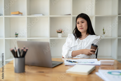 Young businesswoman takes a coffee break while working using a laptop in a bright office. Think and look away