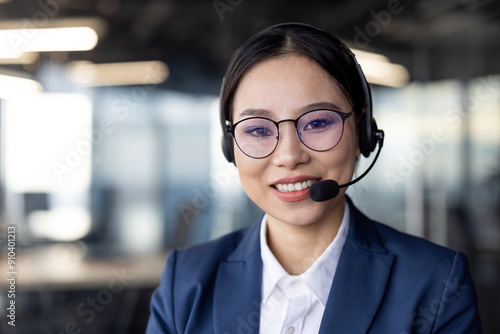 businesswoman, video, call, headset, goggles, office, communication, client, service, professional, portrait, chinese, technology, female, woman, talking, conference, assistant, business, virtual, meeting, support, work, executive, manager, employee, corporate, formal, team, colleague, adviser, tech, center, client, contact, personnel, representative, engagement, interact, connectivity, online, digital, network, workspace, serious, focused, engaged, career, smile