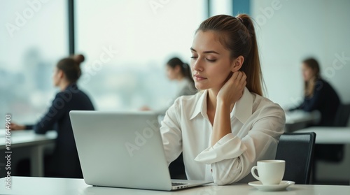 businesswoman, woman, female, professional, office, laptop, computer, working, business, technology, corporate, career, job, employee, contemporary, stylish, elegant, white shirt, hot drink, coffee break, break, relax, sleepy, focused, concentration, multitask