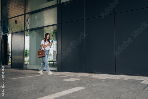 Young busy successful beautiful Japanese business woman, Japanese professional businesswoman holding cellphone using smartphone standing or walking on big city urban street outside