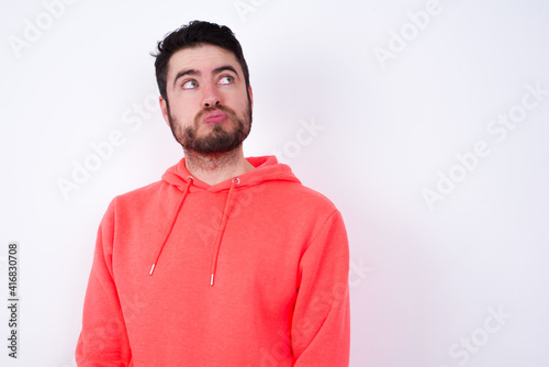 young Caucasian bearded man wearing pink hoodie against white background, looks pensively aside, plans actions after university, imagines what to do Thinks over about new project.