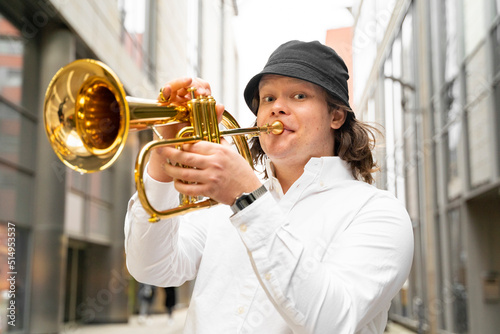 musician, music, one person, outside, playing, performance, artist, blowing, funky, jazz, player, sound, standing, young adult, classical, melody, enjoying, expression, photogenic, individuality, hipster, joy, occupation, practice, shiny, passion, smile, person, instrument, male, hobby, trumpet, man, portrait, young, caucasian, holding, white, happy, avocation, acoustic, people, city street, adult, downtown, shirt, long hair, hat, groovy