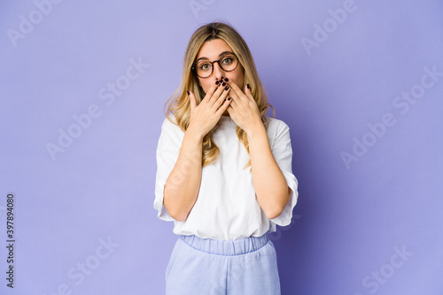 person, woman, attractive, girl, face, female, isolated, portrait, white, young, background, caucasian, student, teenage, goggles, surprised, shocked, mouth, scared, shock, embarrassed, unbelieving, excited, covering, hand