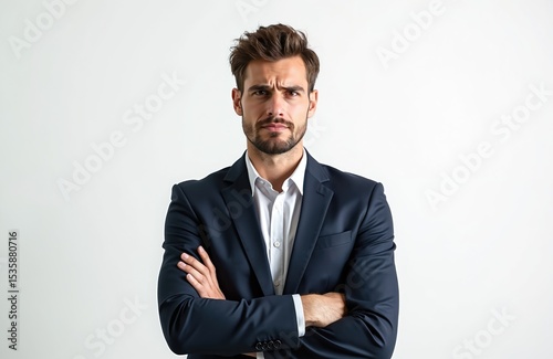 man, business, businessman, suit, young, doubt, doubtful, uncertain, face, expression, isolated, white, background, arms crossed, uncertainty, decision, making, problem solving, career, confident, corporate, executive, entrepreneur, professional, management, leader, office, formal, attire, studio, portrait, modern, elegant, photogenic, stylish, serious, thinking, thoughtful, pensive, question, puzzled, bewildered, confused, sceptical, distrustful, suspicious, critical, judgement, canvasses, consider