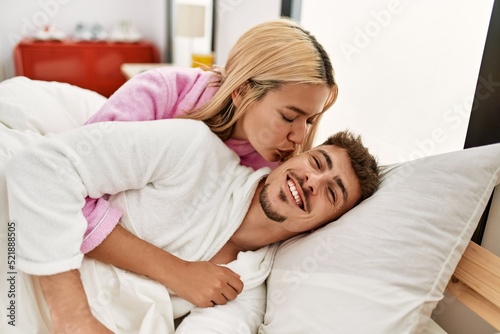 Young caucasian couple kissing and hugging lying on the bed at home.