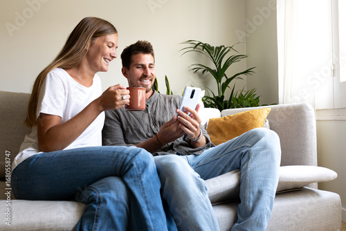 phone, couple, sofa, home, happy, mobile phone, relaxing, together, copy space, couch, young, looking, lifestyle, happiness, woman, smiling, person, man, communication, living room, house, technology, indoor, adult, domestic life, husband, boyfriend, sitting, girlfriend, reading, wife, sharing, female, cheerful, watching, male, smartphone, holding, fun, bonding, cyberspace, message, online, apartment, joy, app, married, enjoyment