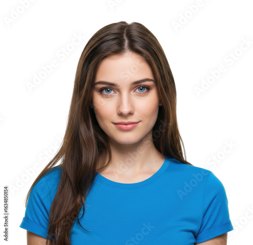 Young caucasian female adult with long brown hair and blue shirt. Cut out PNG