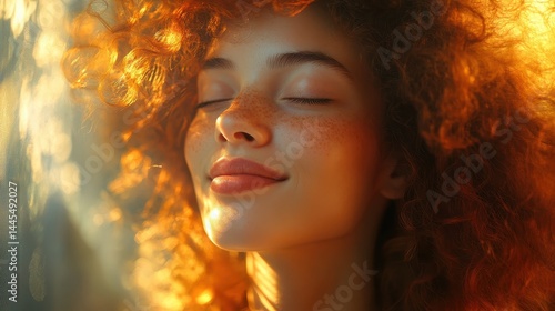 young, caucasian, female, curly, hair, sunlight, eye, closed, smile, freckle, glow, relaxation, serene, peaceful, warm, vibrant, cheerful, happiness, joy, calmness, beauty, natural, radiant, sunshine, portrait, face, outdoors, gold, light, shadow, delightful, tender, soft, blissful, content, freckled, aglow, bright, joyful, nature, time, sunny, fresh, portraiture