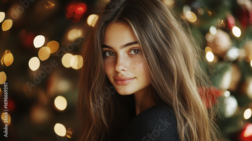 young, caucasian, female, long, hair, festive, holiday, light, portrait, christmas, bokeh, brunette, smiling, winter, season, celebration, face, glow, cheerful, beauty, joy, decoration, sweater, happiness, cosy, soft, sharpened, warm, atmosphere, tree, ornament, indoor, eye, peaceful, serene, elegant, charming, youthful, style, calmness, glamour, gentle, allure, attractive, pretty