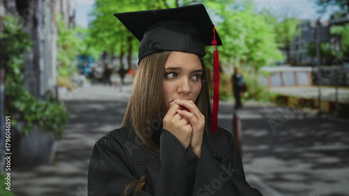 Young caucasian girl wearing graduation cap bites fingernails on street in front of building and green trees; anxiety uncertainty.