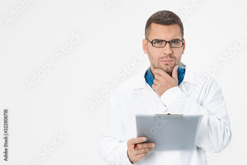 doctor, medicine, photogenic, practitioner, profession, professional, man, stethoscope, caucasian, specialist, background, uniform, white, male, isolated, young, medicals, thought, portrait, physician, person, occupation, thoughtful, studio, adult, concept, pensive, equipment, expression, instrument, job, guy, health, medic, care, people, hospital, clipboard, men at work, wear, tool, look, career, hold, standing, staff, serious, general, thinking, copy space
