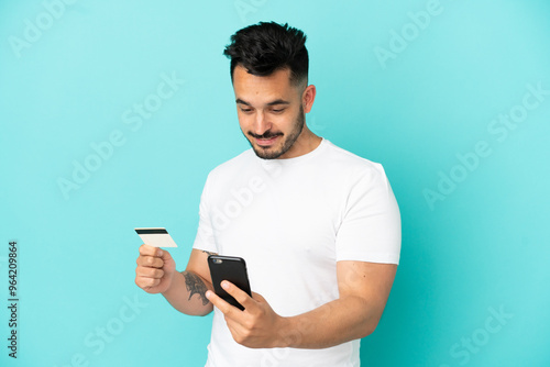 Young caucasian man isolated on blue background buying with the mobile with a credit card