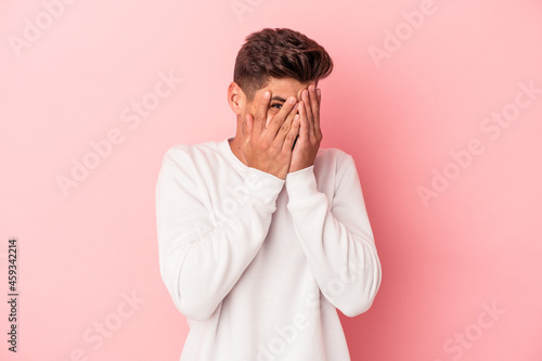 Young caucasian man isolated on pink background blink at the camera through fingers, embarrassed covering face.