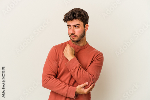 Young caucasian man isolated on white background confused, feels doubtful and unsure.
