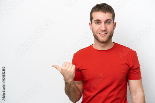 Young caucasian man isolated on white background pointing to the side to present a product