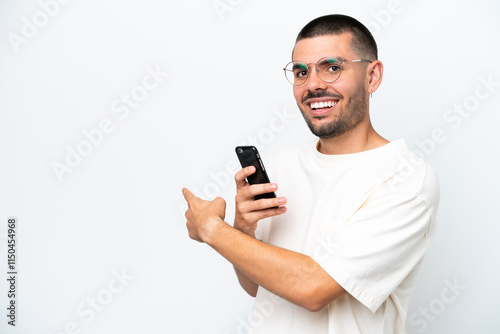 Young caucasian man isolated on white background using mobile phone and pointing back