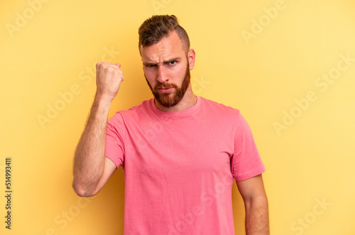 Young caucasian man isolated on yellow background showing fist to camera, aggressive facial expression.