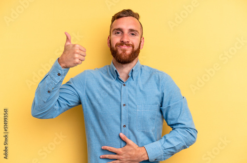 Young caucasian man isolated on yellow background touches tummy, smiles gently, eating and satisfaction concept.