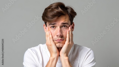 young caucasian man looking worried, resting face in hands against gray background. expression of stress or contemplation. emotion, lifestyle, personal reflection. mental health, toothache