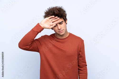 man, man, people, person, male, guy, studio, photogenic, young, adult, hispanic, caucasian, background, isolated, blue, sleepy, portrait, sick, emotion, problem, ill, head, depression, lazy, expression, sad, stress, stressed, exhausted