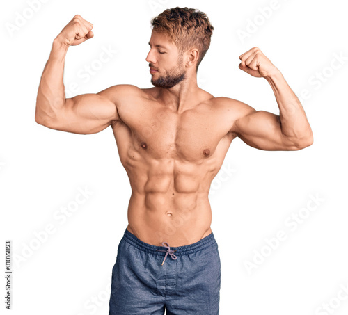 Young caucasian man standing shirtless showing arms muscles smiling proud. fitness concept.