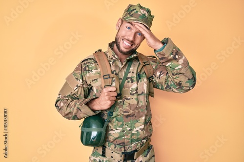 Young caucasian man wearing camouflage army uniform and canteen stressed and frustrated with hand on head, surprised and angry face