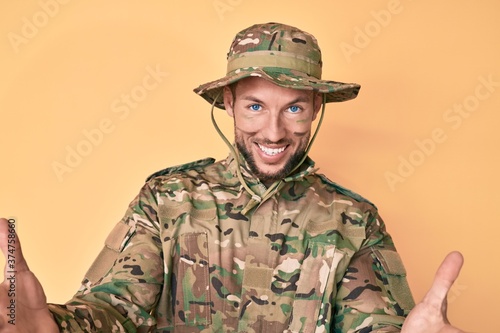 Young caucasian man wearing camouflage army uniform looking at the camera smiling with open arms for hug. cheerful expression embracing happiness.