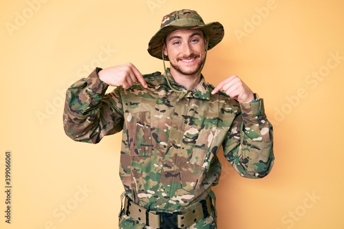 Young caucasian man wearing camouflage army uniform looking confident with smile on face, pointing oneself with fingers proud and happy.