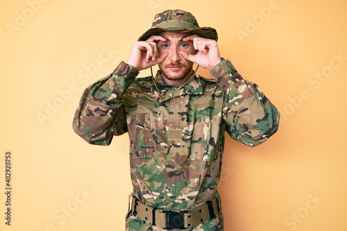 Young caucasian man wearing camouflage army uniform trying to open eyes with fingers, sleepy and tired for morning fatigue