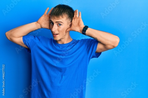 Young caucasian man wearing casual blue t shirt smiling cheerful playing peek a boo with hands showing face. surprised and exited