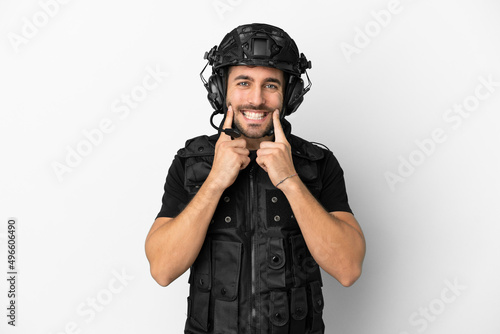 Young caucasian swat isolated on white background smiling with a happy and pleasant expression