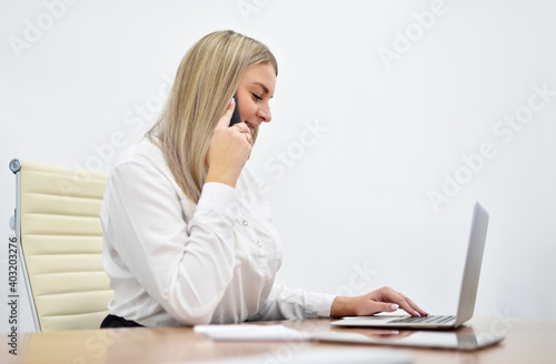 Young caucasian white woman talking on smartphone and working with laptop in office