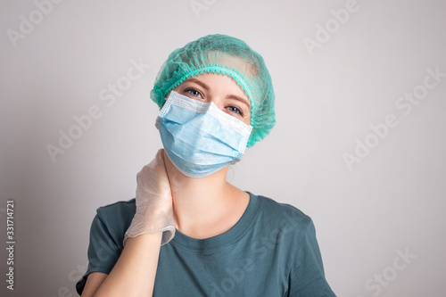 Young caucasian woman doctor nurse in surgical mask looks tired