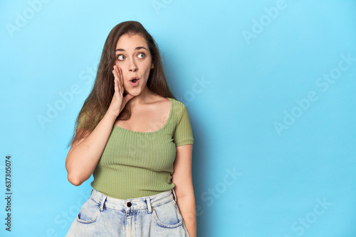 Young Caucasian woman in a green top on a blue backdrop is saying a secret hot braking news and looking aside