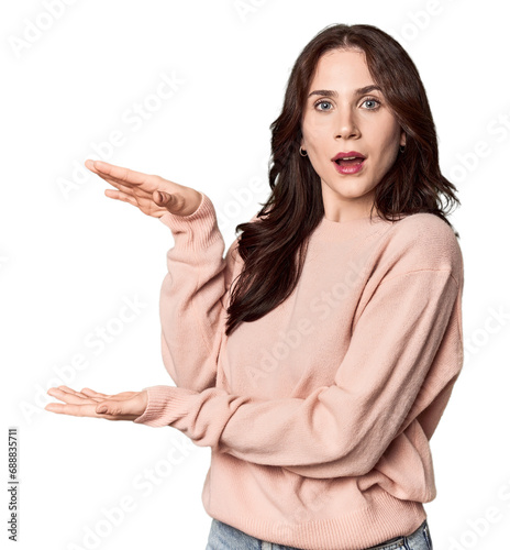 Young Caucasian woman in a studio setting shocked and amazed holding a copy space between hands.