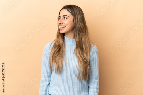 Young caucasian woman isolated on beige background looking to the side and smiling