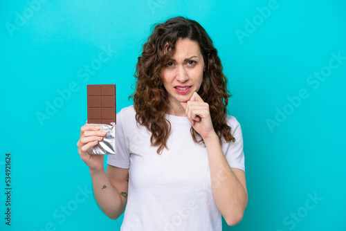 Young caucasian woman isolated on blue background taking a chocolate tablet and having doubts