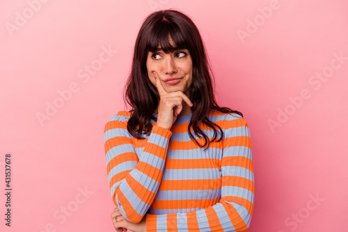 Young caucasian woman isolated on pink background contemplating, planning a strategy, thinking about the way of a business.
