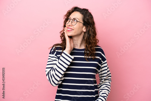 girl, woman, people, person, female, woman, lady, attractive, beauty, pretty, beautiful, youth, young, adult, brunette, curly, caucasian, 1, portrait, coiffure, hair, background, isolated, wall, colours, colourful, pink, looking, up, lucky, thoughtful, head, look, thinks, thinking, eye, concept, happy, smile, confident