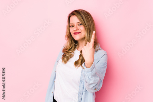 Young caucasian woman isolated on pink background pointing with finger at you as if inviting come closer.